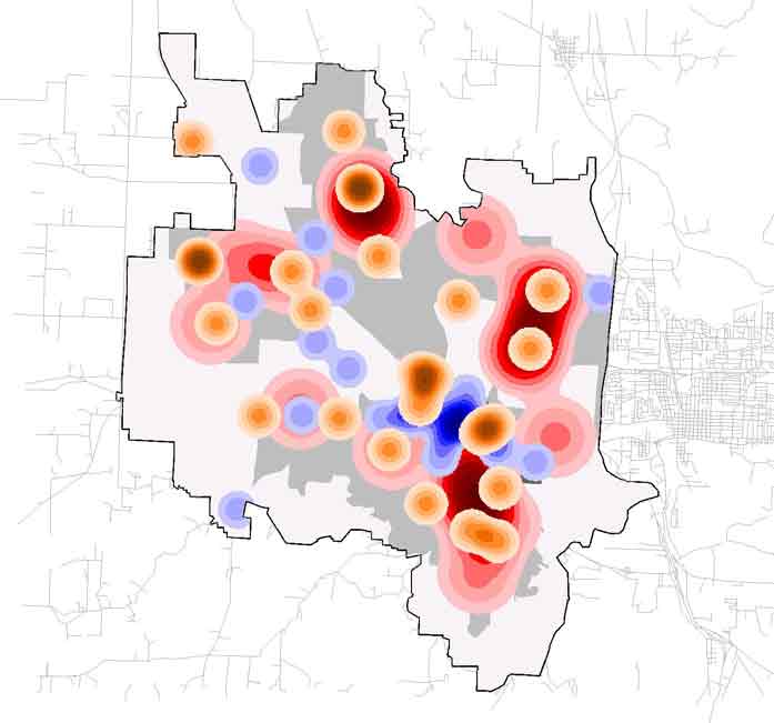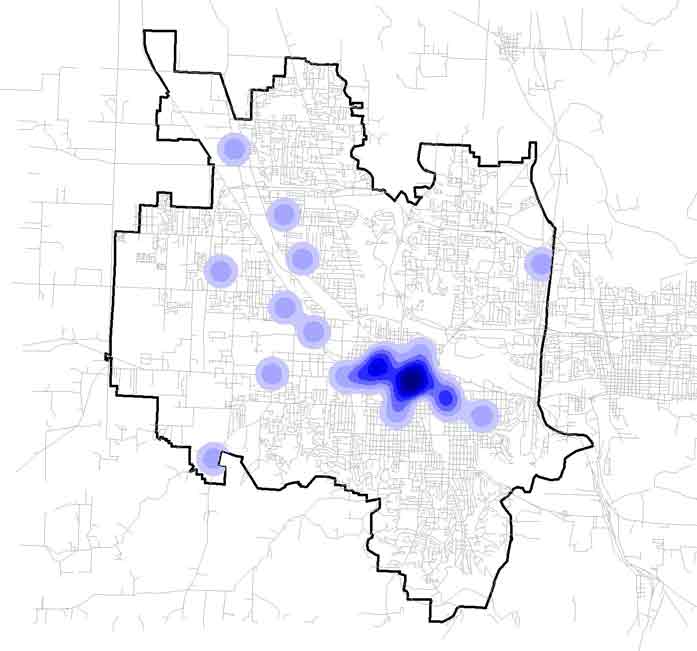 The map in Figure 5 shows access to convenience stores. in this case, distances from stores is calculated at a quarter mile - a distance many planners use when thinking about pedestrian accessibility. In this map, there are some areas with concentrations of convenience stores, but in general such stores are relatively isolated from one another and spread throughout the city. |