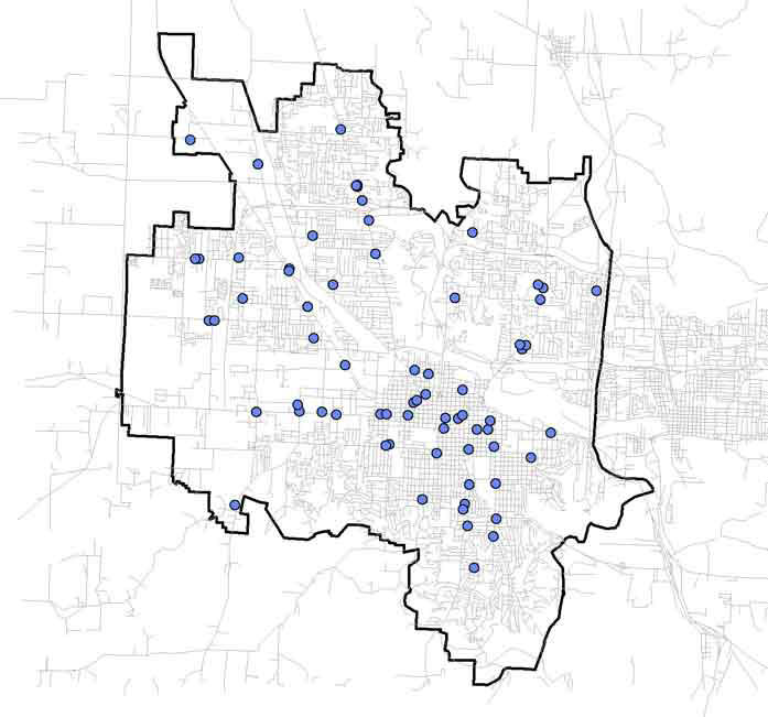 The map in Figure 1 shows the location of sixty-nine different food markets. The underlying street network is displayed as well, providing an initial visual understanding of the urban form throughout the city. Where there is a concentration of stores in the center and center-south area, there is also a fairly tight gridded street network, representing a traditional downtown and neighborhood area in close proximity to the University of Oregon. |