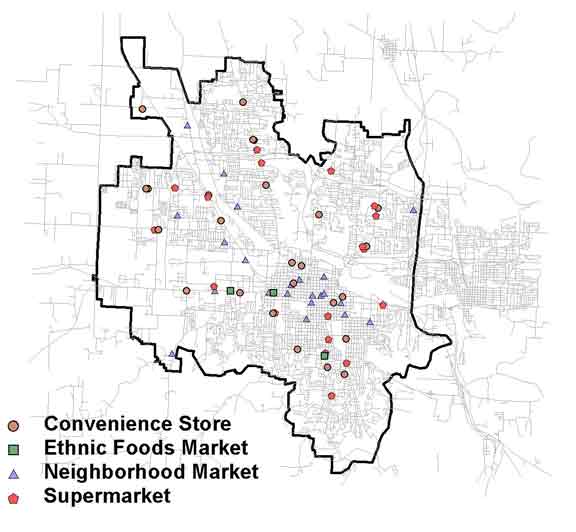 Spatial analysis combined with the visualization of food outlets offers planners, community activists, public health officials, and those generally concerned with equitable access to food a means to understand the spatial extent of retail food distribution in their community. Mapping software that interacts with an underlying database (Geographic Information System, GIS, software) can provide a powerful tool for facilitating the community dialogue that will be necessary to enhance food security in communities across the country; these maps represent one approach to moving that dialogue forward. |