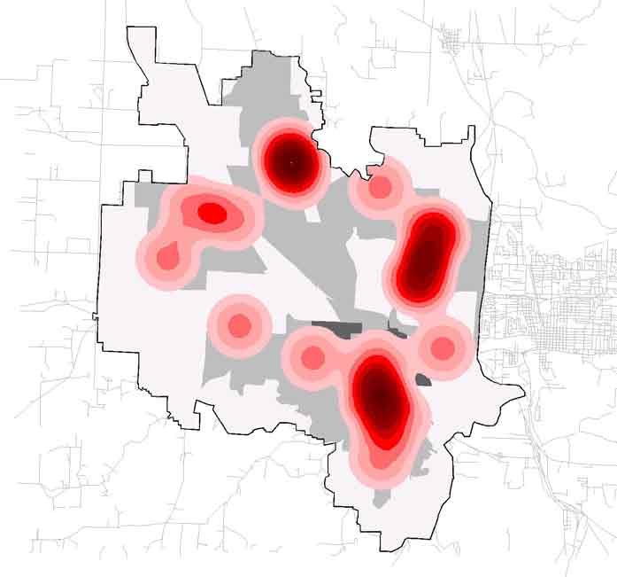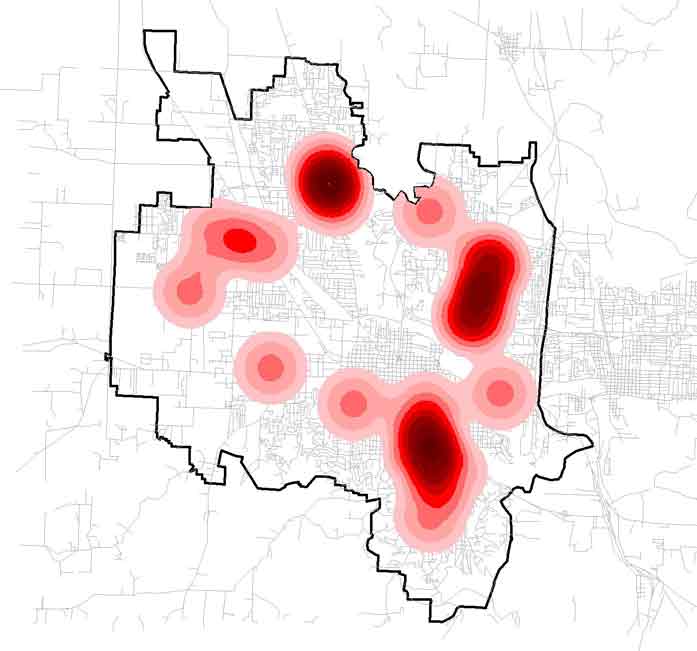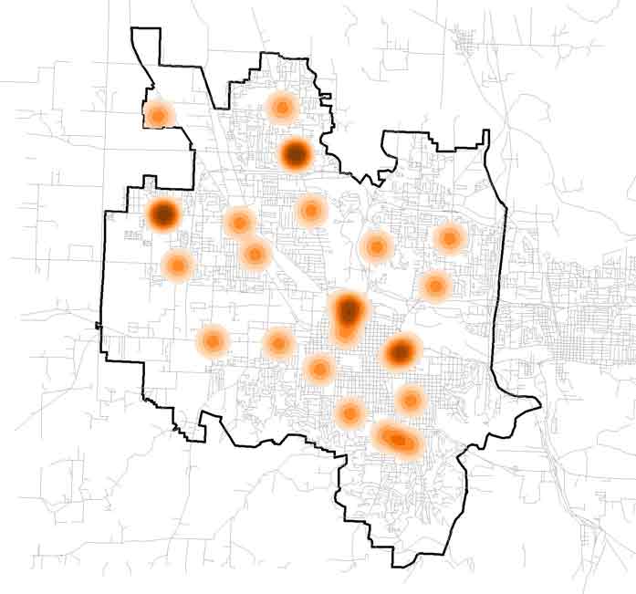 while the darkest reds represent areas in Eugene that have access to multiple