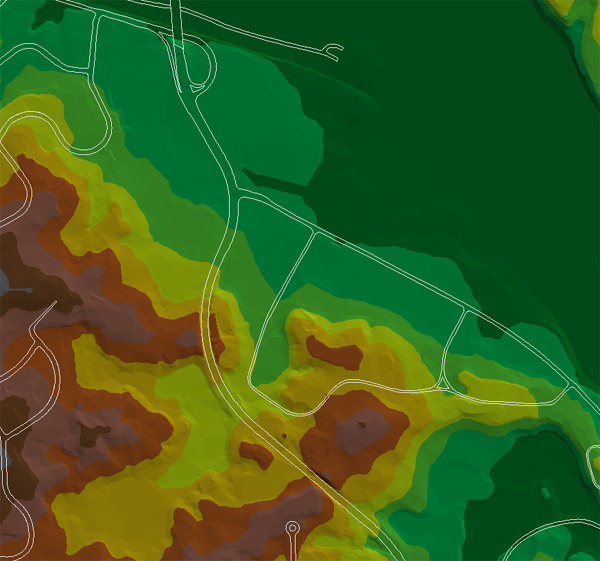 Much of the beauty and the challenge of this course comes from its rolling surface. This linked image, a Triangulated Irregular Network (TIN), represents the topographic surface on which the Huron Hills course sits (it was made using the City contour map as a base in ESRI software). The white lines in the image represent the roads in the area. The roads serve as a guide in placing the golf course within this picture. The contour of the golf course is undulating, especially the back nine, (the lower left corner). The change in color signifies a change in elevation of 15 feet.