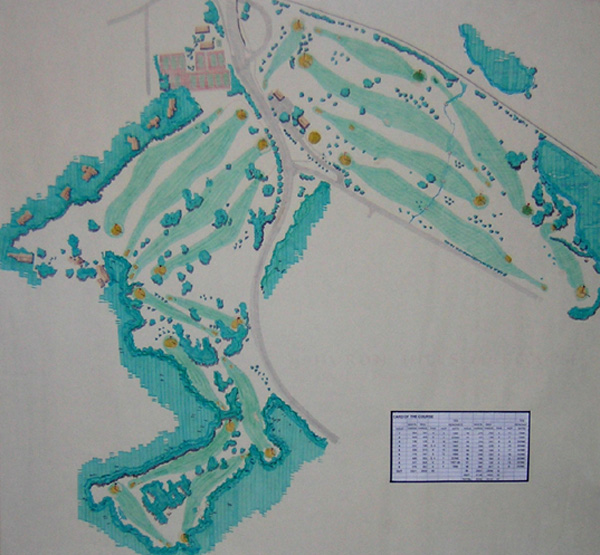 This linked image of the course has hung in the course clubhouse for many years. This image of Huron Hills is outdated and also has errors regarding course elements. A new wall-sized course map, derived from the clickable image above, now hangs in the clubhouse. One advantage to having a computerized image is that it is easy to change as the golf course changes. The old can be merged with the new, as in this link.