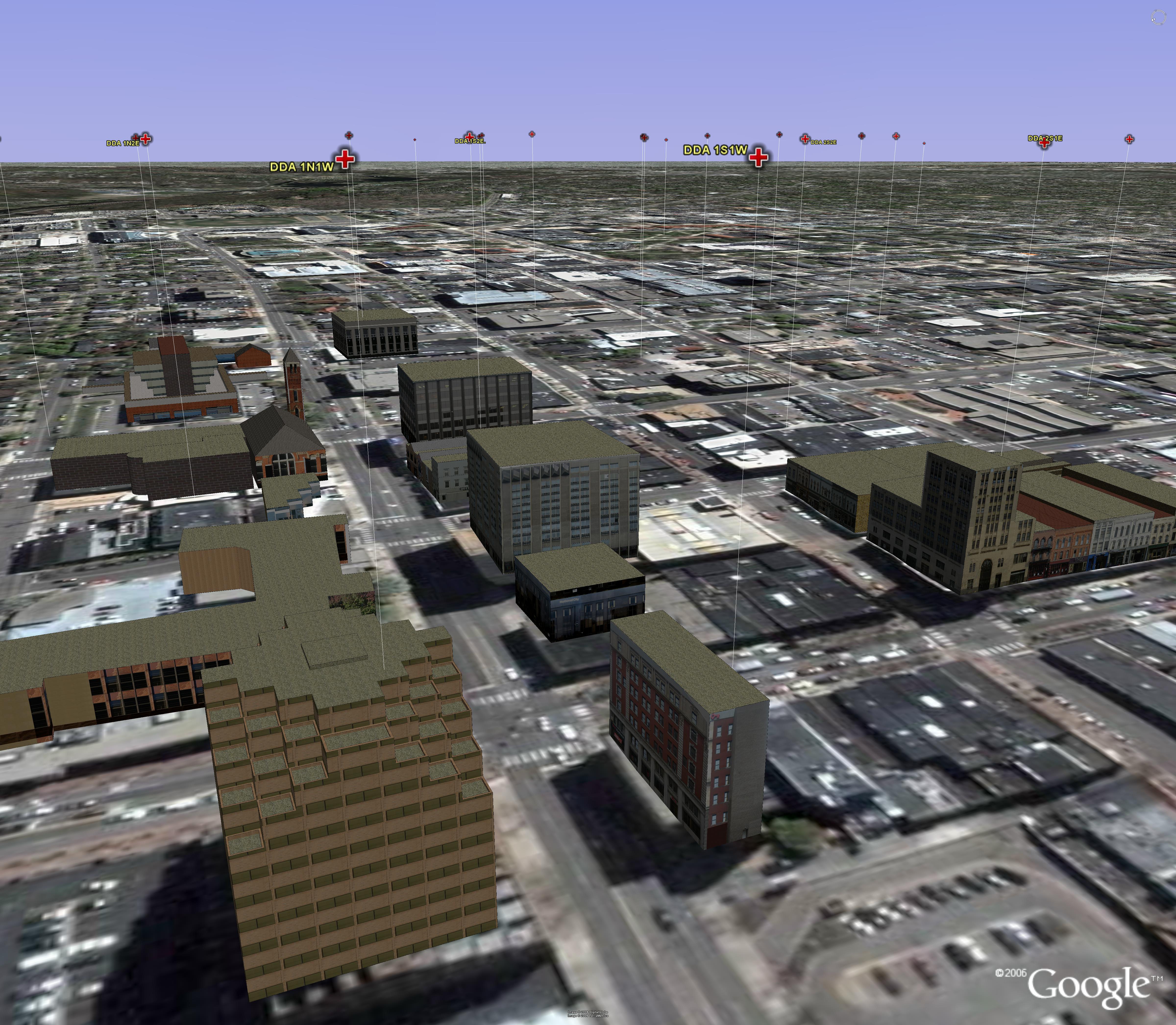 ![]() Figure 2. Overview of buildings positioned against aerials on the surface of the Earth. The "balloon" markers offer reference points to a coordinate system so the driver through the virtual scene does not get lost. |