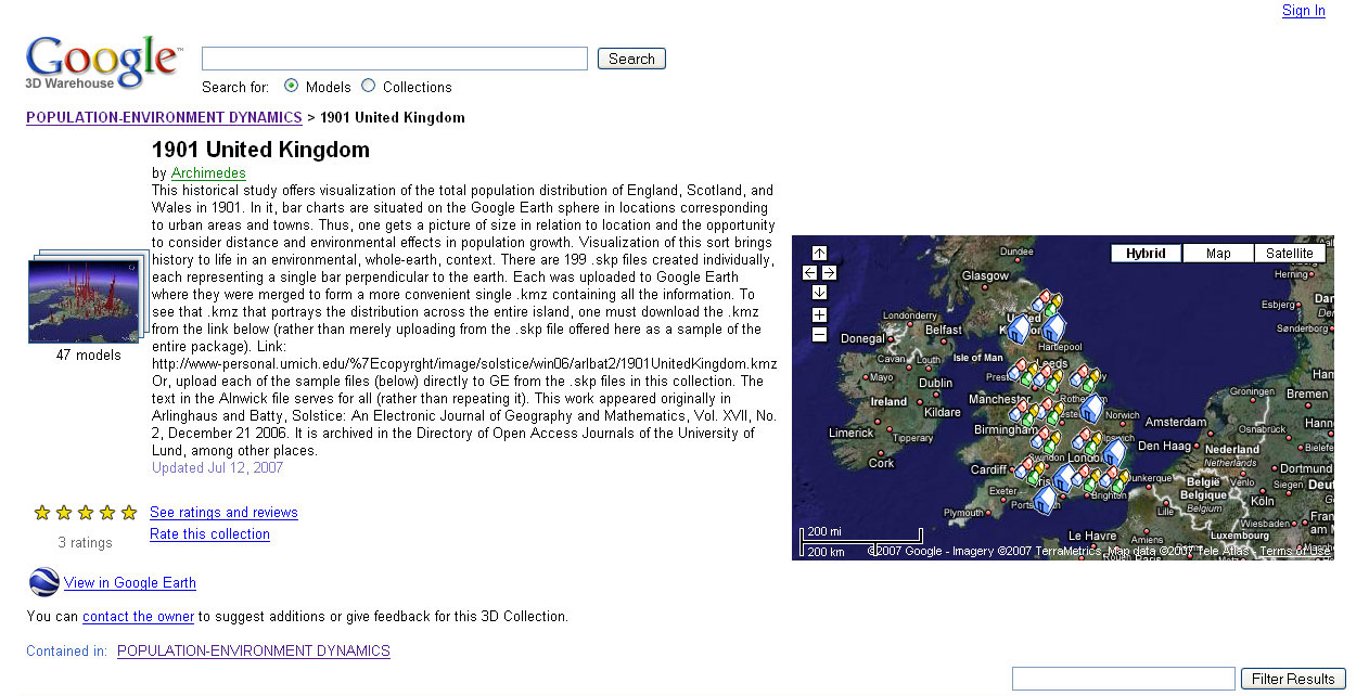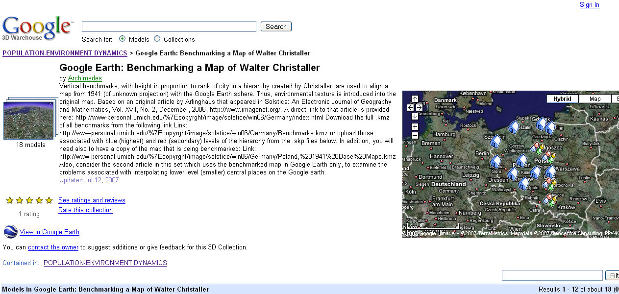 TABLE 2: POPULATION-ENVIRONMENT MODELS OF ARCHIMEDES. Material in the table is formed from screen captures of content from the Google 3D Warehouse. The links that show visualization of the geometric components of Christaller's historical urban hierarchy use the power of the method to visualize historical materials. So, too, do the links to historic demographic data. When buildings and bar charts are envisioned as topologically equivalent then it becomes a simple matter to envision population data in place on the surface of the Earth. Conversely, virtual 3D life can be inserted into two-dimensional graphs that offer only limited views of reality. The final display in this set shows potential flooding hazard, in relation to buildings, in Ann Arbor, Michigan. These virtual 3D models have been employed by both planners and staff in City Hall as one aid in decision-making. They continue to be used in that manner. |