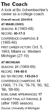 Bo Schembechler, who died Friday, compiled a 194-48-5 record at Michigan from 1969-89 and was seven-time Big Ten coach of the year. More Photos »