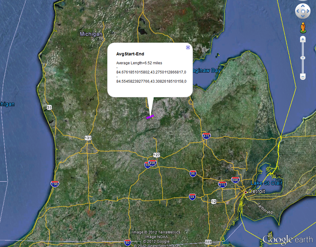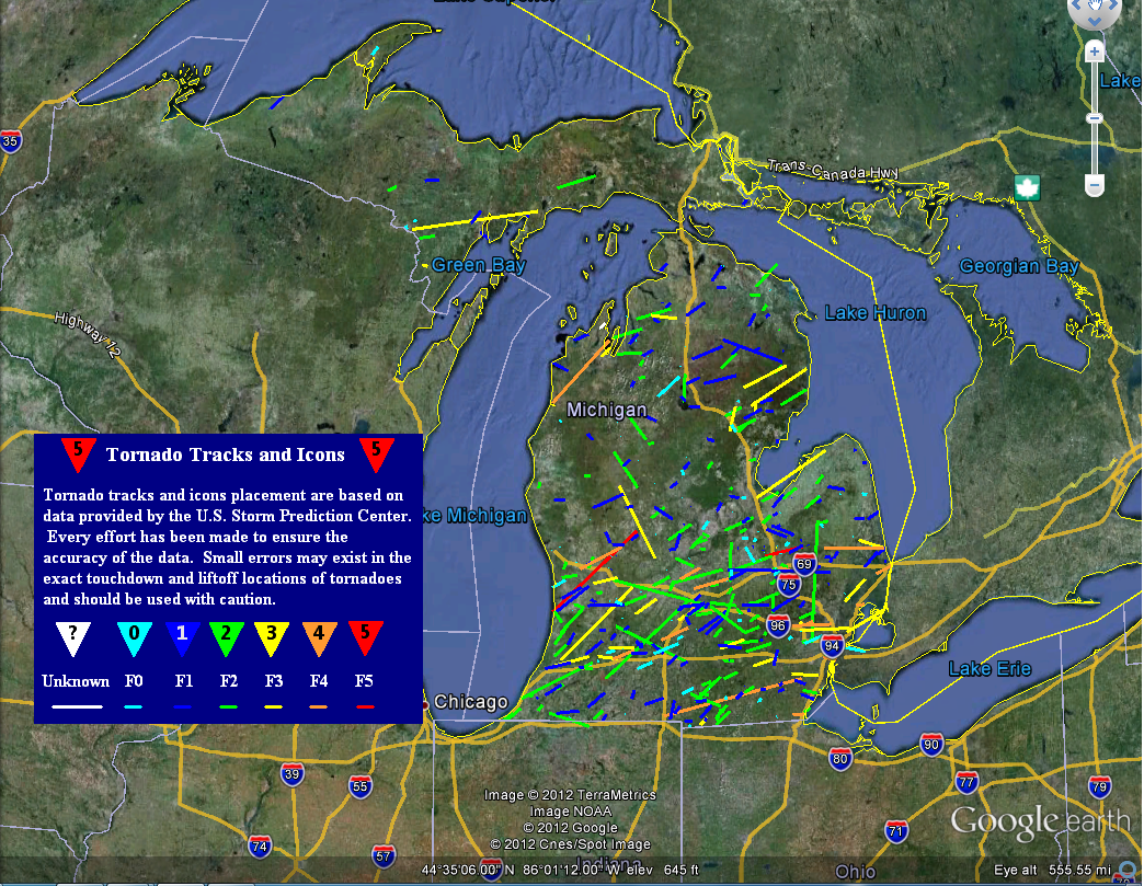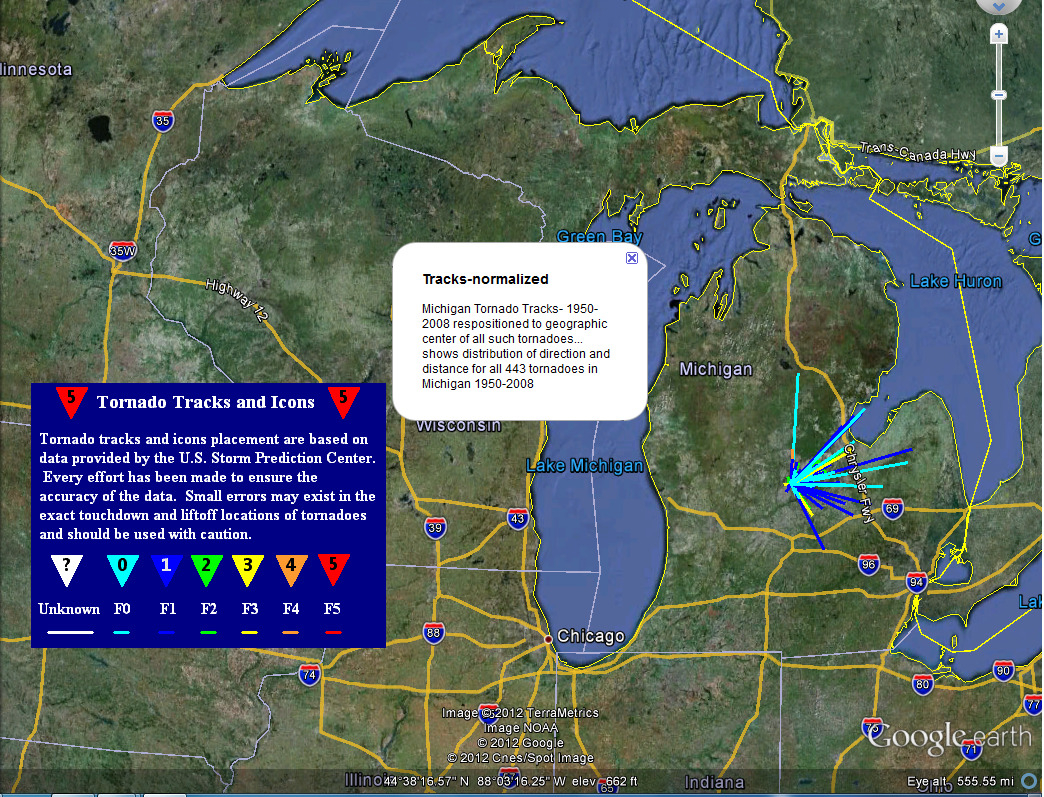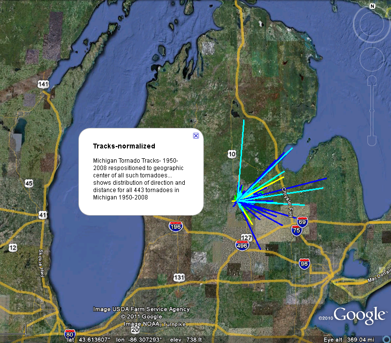 Roger Rayle: Tornado, Dexter Michigan. After the March 15 Tornado in Dexter, I posted some screen images from a Google Earth mashup of all tornadoes in Michigan from 1950-2008 ... and one of the 3/15 tornado's path... both from the National Weather Service. In addition, I shared an earlier mashup I created from the 1950-2008 tornado data to show what their paths would look like if all originated at their average geographic center. The Dexter tornado was unusual in two ways: it occurred in March, rare for Michigan, and it traveled southeast rather than the more common east-northeast. ![]() |