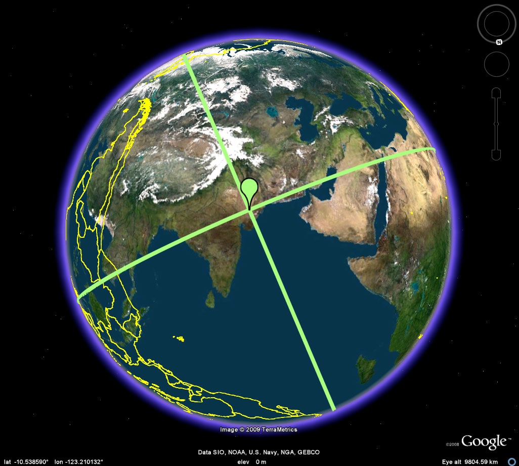 ![]() Figure 8a. Both Easter Island and its antipodal point in the Thar Desert serve as poles for the embedding of the icosahedron in the sphere. Each is surrounded by a set of five adjacent vertices, all of which must be land based. While one might imagine such a possibilty surrounding the Indian location, it is clearly not possible for the Easter Island set. The magnitude of the Pacific Ocean makes it impossible, at least at this scale and perhaps at all others! Take a further look in the .kmz file. |