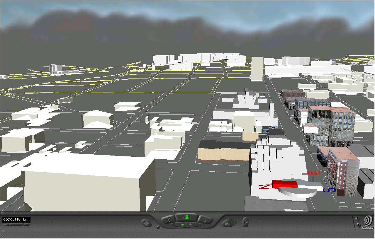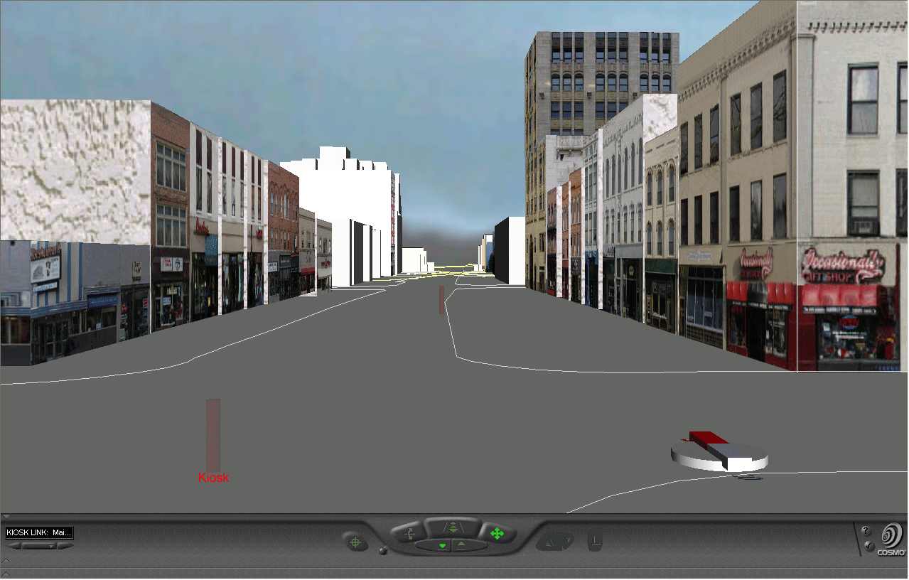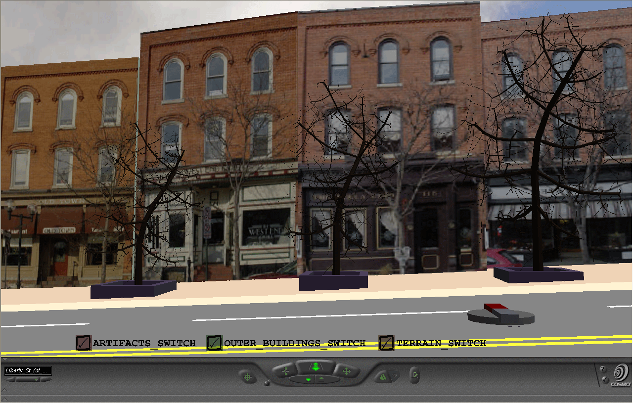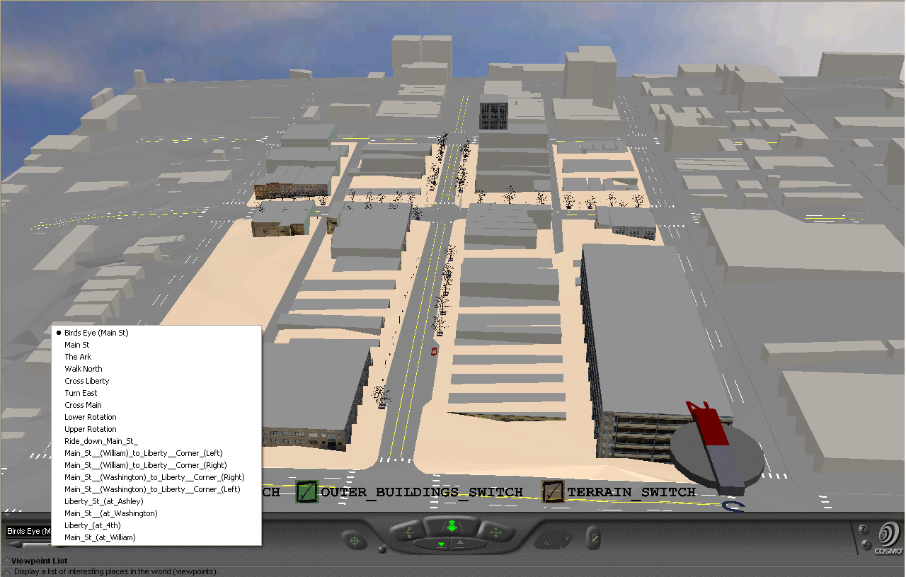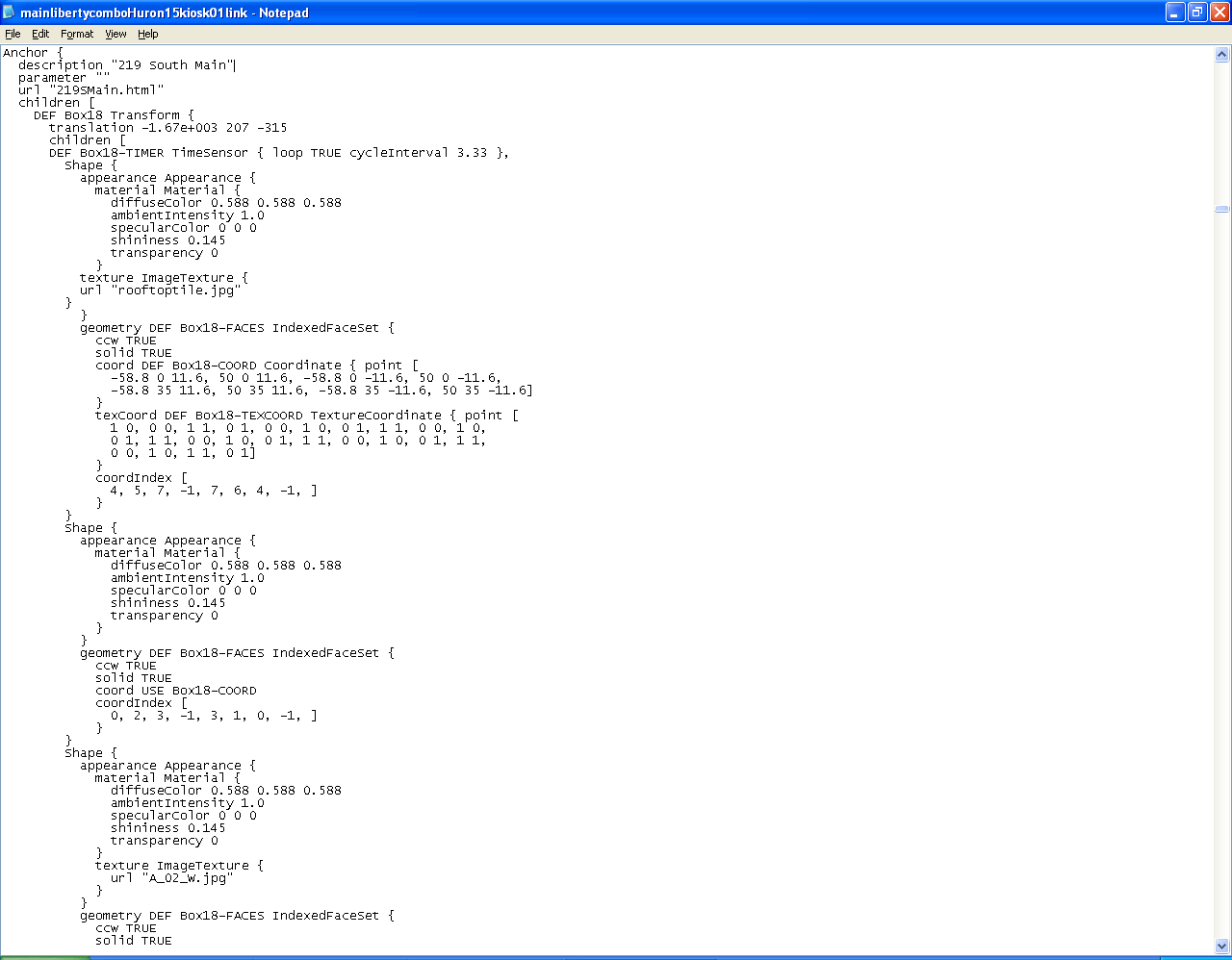 Follow the path suggested in the table above to become familiar with navigation through the various layers of the model. Use viewpoints or drive freely within layers. One entry point to the virtual world offers access to a wide range of virtual files. An important aspect of such transformation is thus that one can have many files together in a single file no heavier to view than the single heaviest layer of the hierarchy. It would not have been possible, using merging techniques or some such equivalent strategy, to create the entire set as a single file. When kiosks (or some conceptually equivalent mechanism for jumping between hierarchical levels) are employed, it is easy to imagine emergency managers training first responders to fly through a small file of the entire city with chunky buildings in order to learn the general city layout. When each street corner or other strategic location in this general model is marked with a kiosk then with one click of the kiosk a detailed model pops up, while additional clicks on individual buildings in this detailed view reveal the interiors of buildings as html files. This sort of arrangement has been created for the City of Ann Arbor (and given to them). Creation of the model has taken several years and involved the use of a wide variety of resources, both human and digital. Maintenance, however, can be achieved using a simple text editor to alter the underlying code in either the html files or in the vrml files (part of the code for one building is attached). Thus, highly computer-literate City employees, armed with digital cameras and good computing resources can maintain the model and insert changes and additions to suit a variety of needs and interests: the process is in place. The arrangement of spatial information in a hierarchy is an efficient arrangement not only in the classical worlds of pen and paper but also in the contemporary world of digital models as well as in the practical implementation of such hierarchical arrangements in the real world.