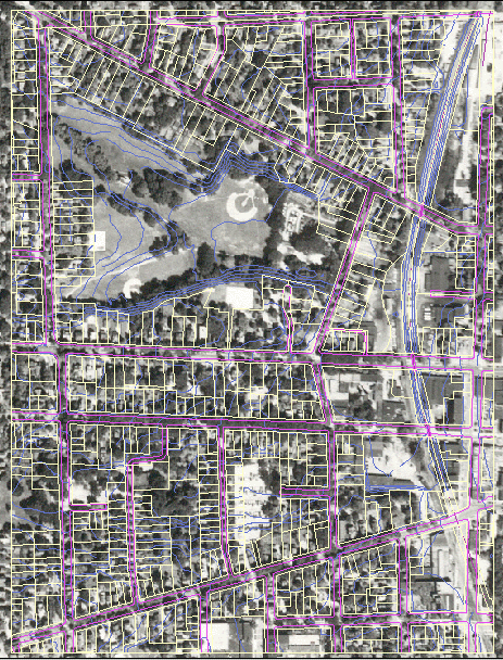 This is an aerial photograph of the project site in 1955, with street and parcel data overlaid. The pond seen in the earlier 1947 aerial is gone from West Park. Tree cover appears more dense; however, this is due to the foliage present on the trees that was not present in the 1947 view. Note that the parking lot between Murray and Third Streets is expanded.![]()