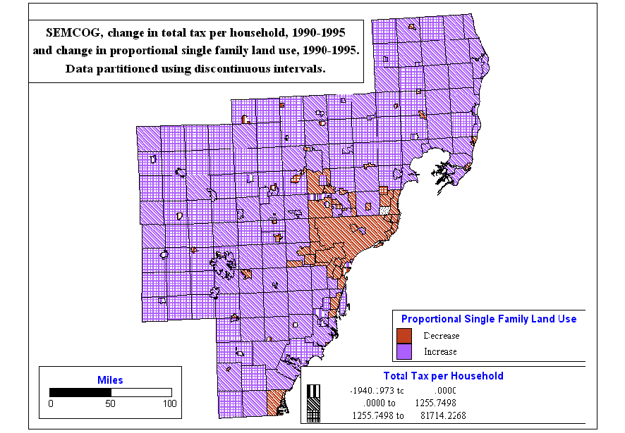 Total tax per household change vs. low-density residential land use change: The pattern here is similar to that of school tax per household change because school tax is a significant part of total tax.