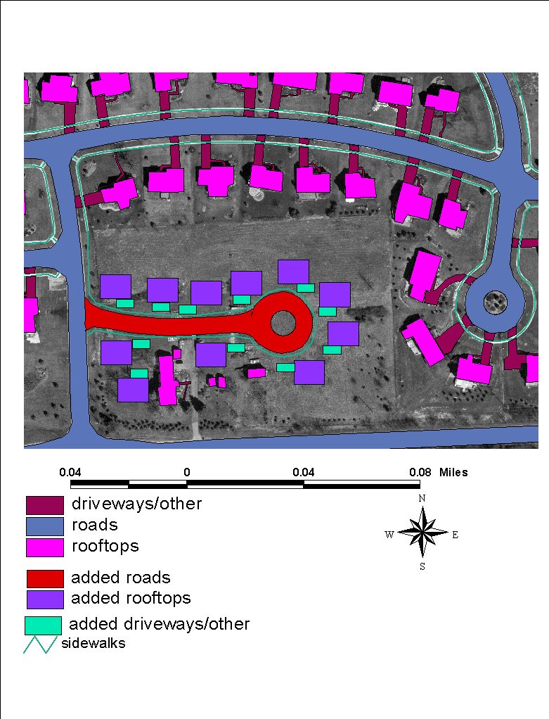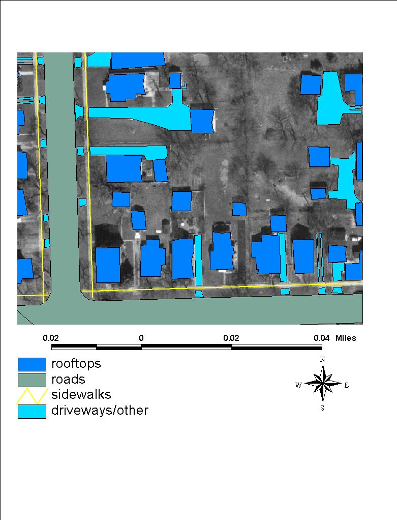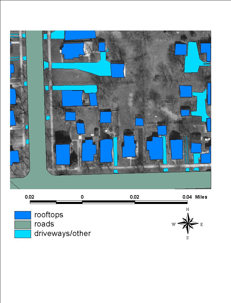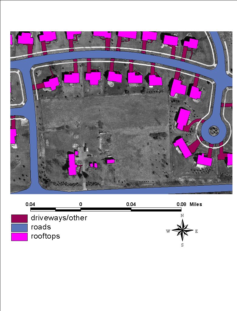 Photos are a half foot pixel resolution - impervious surfaces could be identified with relative ease. New layers were created using on-screen digitizing.