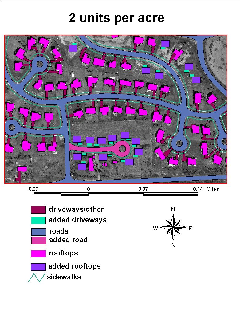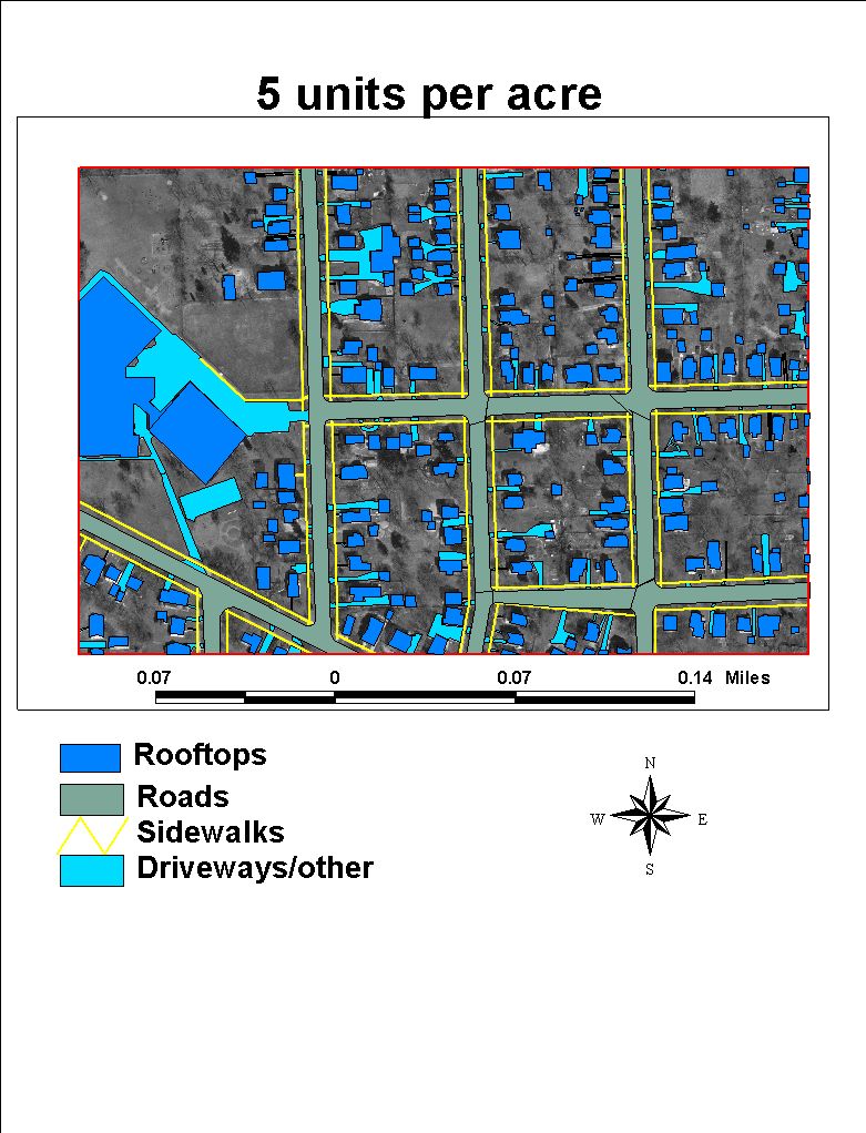 | Total Area (acres) | Pervious Area (acres) | Impervious Area (acres) | Housing Units per Acre | Total Units | Imperviousness per Unit |