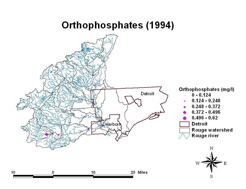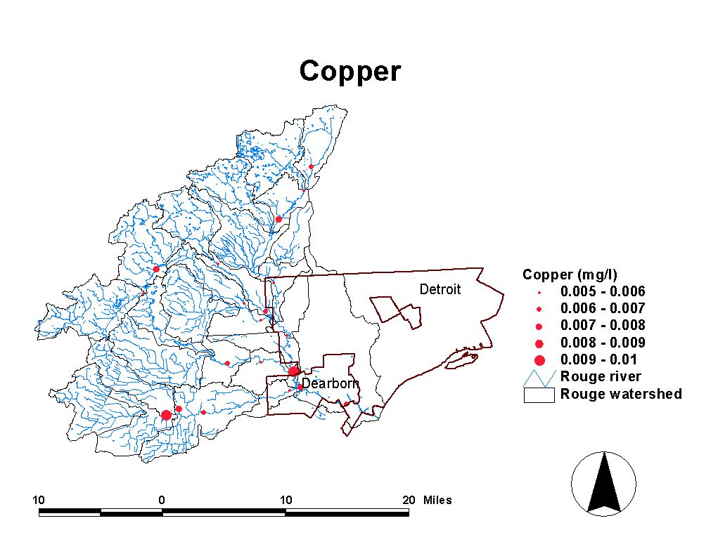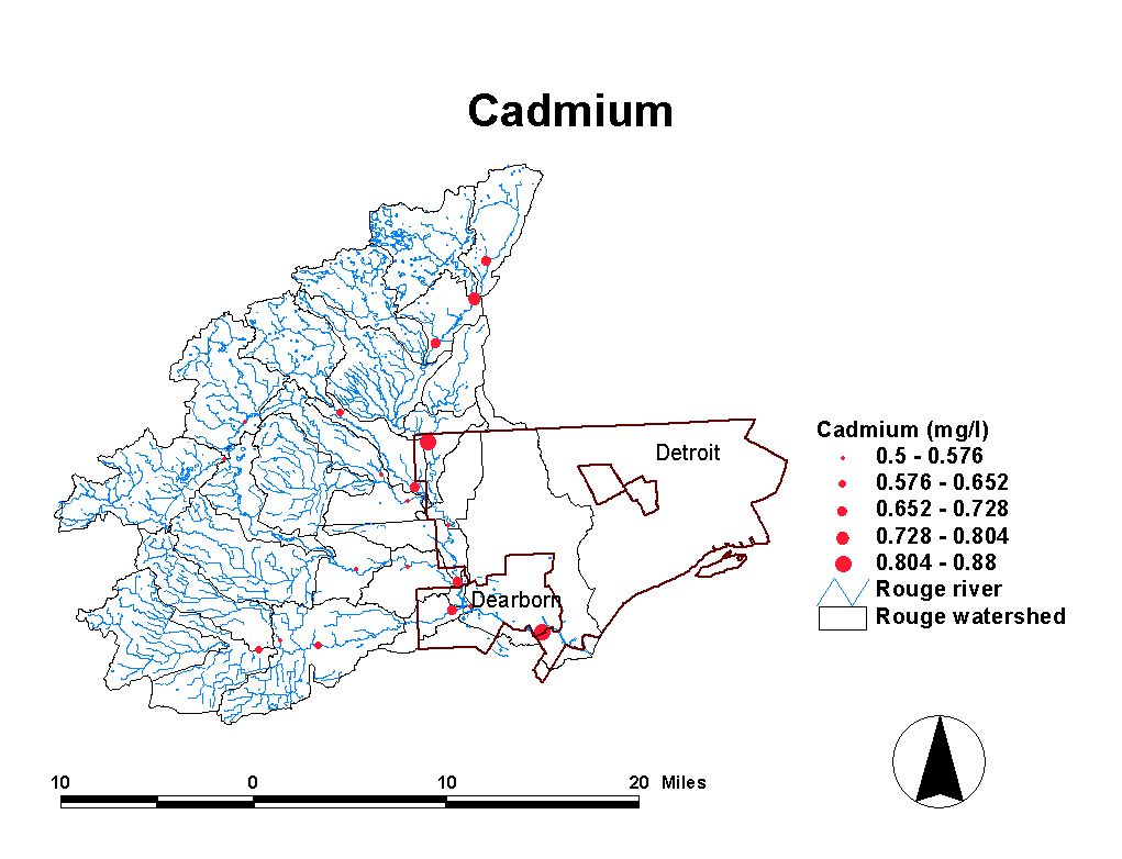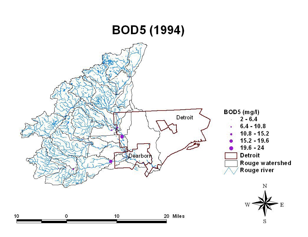 Detailed data on water quality for the Rouge River Basin was obtained from the Wayne County Rouge River National Wet Weather Demonstration Project (1999). This data was processed, in order to determine the variation of concentration of specific pollutants over the time period between 1994 and 1998. Not all sites were sampled every year for all contaminants, making any comparative analysis difficult. However, animation maps allow to see that changes in concentration occur through time, and the variation pattern might indicate the response to specific contaminating events, rather than due to more permanent land use patterns. The animated maps of those contaminants that were sampled more frequently are listed below:
