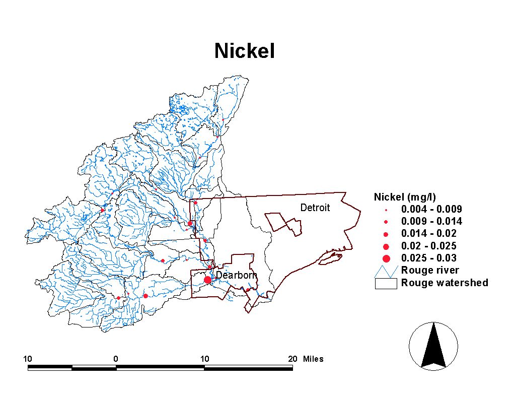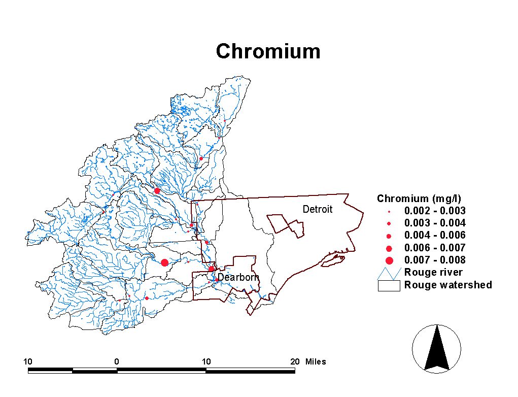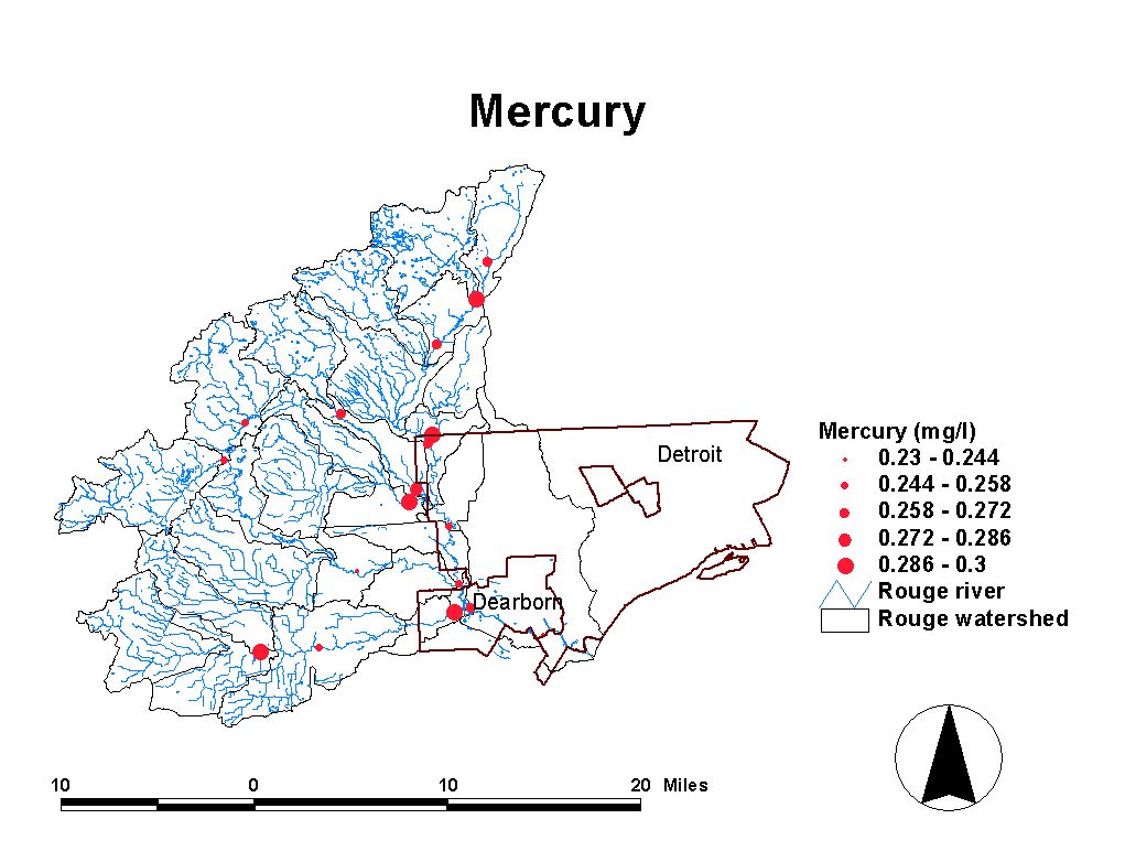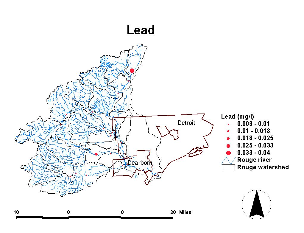 The River Rouge has been studied extensively, and sampling data on various contaminants can be found at the River Rouge Project website. The way it is set up, it is difficult to see how water quality regarding specific contaminants varies spatially. In an initial attempt to show spatial variation of water quality, I digitized the sampling points and converted all the data tables into one single table with the average concentration of the main contaminants sampled at each point, and mapped the data with graduating symbols.