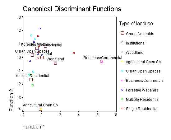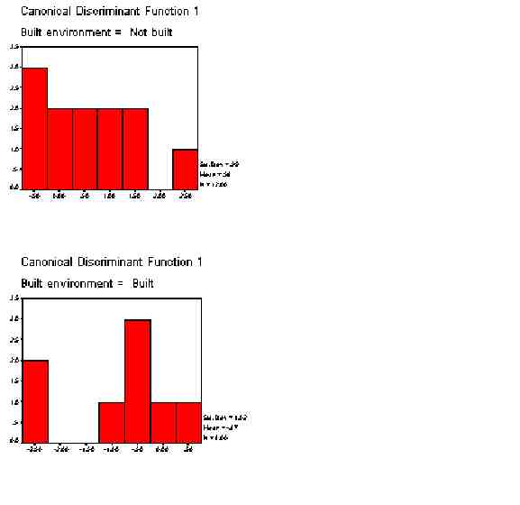 A discriminant analysis showed that there is a 30% overlap between the groups defined by sensitivity to imperviousness. This might be a good result, but corresponding eigenvalues were too low and Wilkin's Lambda values were too high. The discriminant analysis using land use categories, on the other hand, resulted in much higher eigenvalues and lower Lambdas. However, the error was of 35%. Some grouping may be observed for less intensive use of land (see graph). Comparing built with non-built environments, the results of the discriminant analysis have a lower error, 25% (see graphs). However, the eigenvalues and Lambdas are not very good.