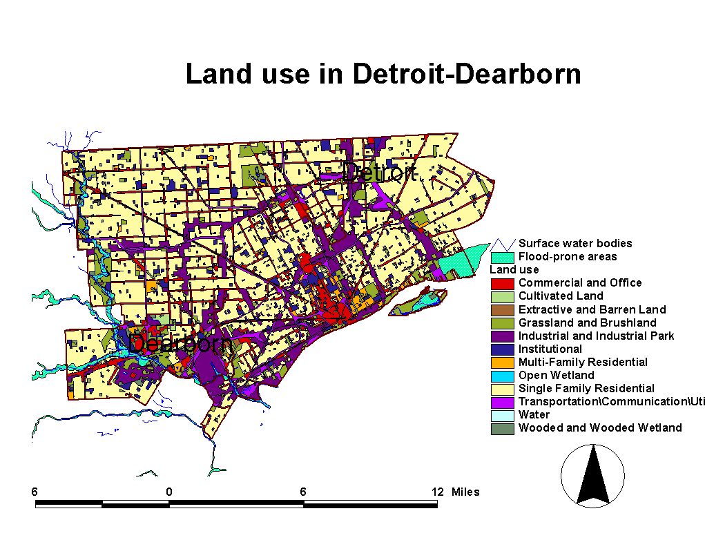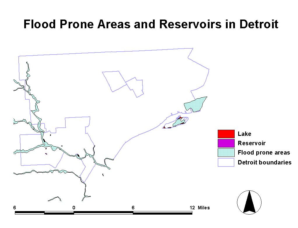 The mission has changed somewhat since this project started. Initially, the objective was to identify opportunities for greenway development, particularly around the Rouge River. Using fractals and self-similarity as an approach to locate areas of concern regarding drainage, was a second step. The northern area of Detroit, for example, does not show any drainage (see flood-prone areas). Pre-settlement maps, however, show that there were many intermittent water bodies in the area, which were probably paved over. Finally, this study focused on water quality in the Rouge river.