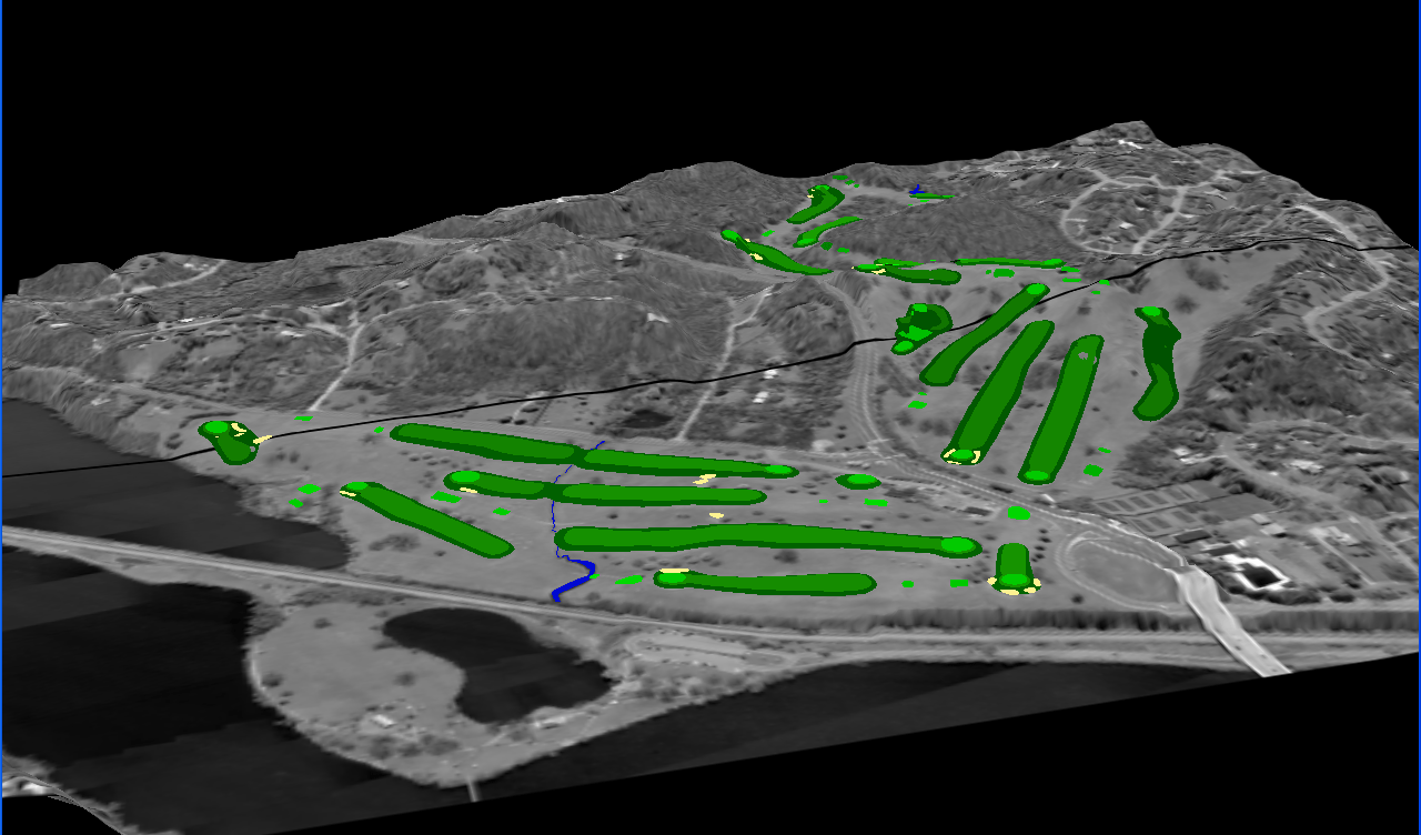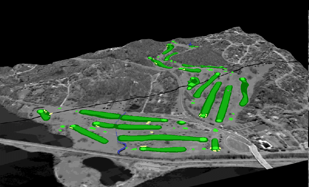 Images that are TINs are useful as a base over which to drape other images. The next linked image was made by extruding the TIN in 3D Analyst Extension to ArcView GIS (ESRI trademark), draping the City aerial flown in 2002 over the TIN, and finally superimposing the GIS layers from the map above in order to show location of golf course holes in relation both to the topography and to the broader urban setting depicted in the aerial. The final link shows an animation of this draped image, from various vantage points (click the reload button to restart the animation). The golfer thus has a bird's eye view of the terrain as well as the capability to fly over it in a circle and study the lay of the land from various angles.