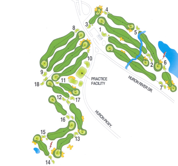 This linked image of the course has hung in the course clubhouse for many years. This image of Huron Hills is outdated and also has errors regarding course elements. A new wall-sized course map, derived from the clickable image above, now hangs in the clubhouse. One advantage to having a computerized image is that it is easy to change as the golf course changes. The old can be merged with the new, as in this link.