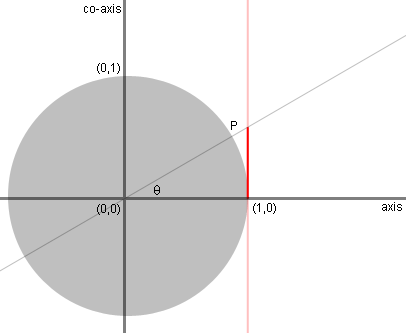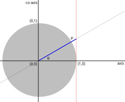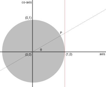 The pink line is a geometric line tangent to the unit circle at (1,0) on the co-axis. |